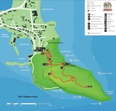 На восточном склоне больше солнца, поэтому характер растительности меняется. Здесь преобладают розмарин и испанский дрок. Тропа тоже становится другой, на ней твердая скальная порода чередуется с каменными осыпями, а местами проходит по узкому карнизу, нависающему над бездной. На таких сложных участках натянут толстый страховочный канат, укрепленный прямо на каменной стене. Вокруг разбросаны кусты обычного и черноплодного можжевельника. Почти как в сказке появляется не камень, но знак с двумя стрелками указующими в разные стороны. На этой развилке предстоит решить, куда двигаться дальше. Направо пойдешь – на вершину придешь, налево свернёшь – до самого края скалы доберёшься. Здесь, на руинах бывшего поста карабинеров, устроена смотровая площадка. С нее открываются роскошные виды на открытое море, близлежащий мыс Сан Антонио и оконечность Морайра.