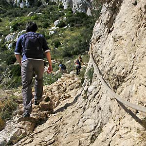 Постепенно тропа приводит к смотровой площадке, где сохранились руины старинной оборонительной стены, возведенной в конце XIII в. Ее кладка вплотную примыкает к поверхности отвесной скалы. Здесь стоит задержаться и обозреть окрестности. Открывающиеся отсюда виды на «Природный Парк Серра Хелада» (юг), на «Охраняемый вид Пуйж Кампанья» (запад), на горы «Сьерра Айтана», бухту Кальпе и прочие красоты побережья Коста Бланка – заслуживают продолжительной фото-сессии.